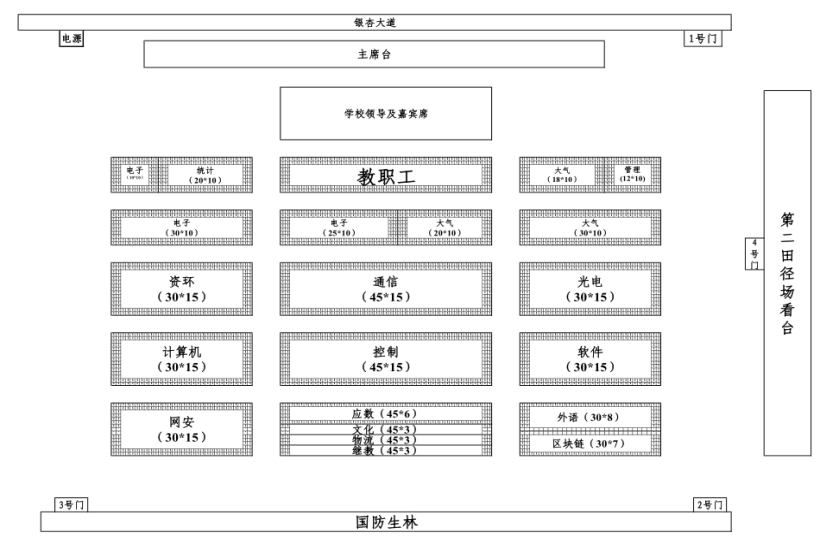 2.各单位组织参会人员在场外指定区域(附件3)集合,整队完毕后,由本单位负责教师带队从指定的通道,按照规定时间有序进入会场就坐。