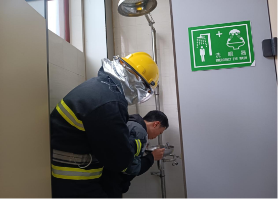 在实验室安全管理老师的协助下,员工火速脱去手套,迅速启用实验室内的洗眼器对受伤眼睛进行冲洗