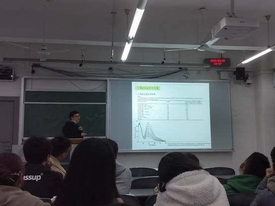 郭旭晶老师就什么是溶解性有机物、光谱学技术和化学计量方法在光谱技术中的应用这三个主题来展开。接着向同学们介绍了溶解性有机物的来源、性质、组成及在环境中的化学行为,让同学们充分理解此类物质对环境的危害。紧接着郭旭晶老师对同学们关于光谱技术知识进行了补充及延申,同时郭旭晶老师也用自己关于光谱技术对于溶解性有机物的相关研究论文和数据,向同学们展示了光谱技术的应用大体思路和方法。最后郭旭晶老师通过介绍一些化学计量方法在光谱技术中的新技术,以此来争取有效地解决环境问题。本次讲座持续了一个半小时,郭旭晶老师的演讲贴近现实,举例丰富,最终在掌声中圆满落幕。