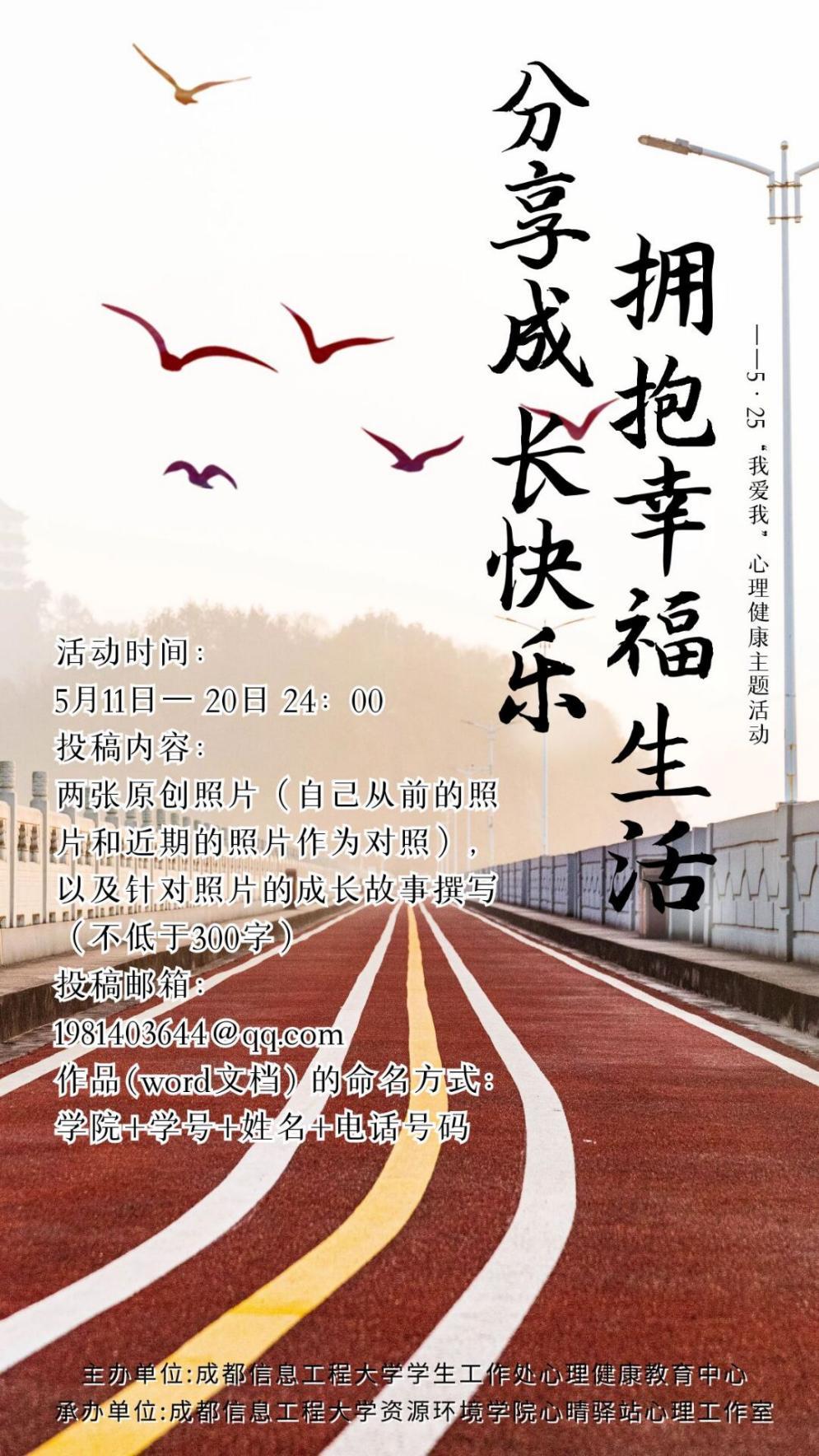 2022年5月,为迎接5·25“我爱我”全国老员工心理健康日的到来,由suncitygroup太阳集团员工工作处心理健康教育中心主办,suncitygroup太阳集团承办的5·25“我爱我”心理健康主题活动拉开帷幕。本次活动旨在帮助同学们回溯自身成长经历,在其中寻找幸福时刻,并认识自我、接纳自我、善爱自我。活动以“分享成长快乐,拥抱幸福生活”为主题的成长图片故事征集,引导同学们与他人分享自己的成长经历,感受成长中的快乐与幸福,展现当代老员工在成长中不断塑造积极健康的心理品质,勇于追求梦想、接纳自我的积极心态,并增进老员工之间的交流,携手共同建设美好校园。