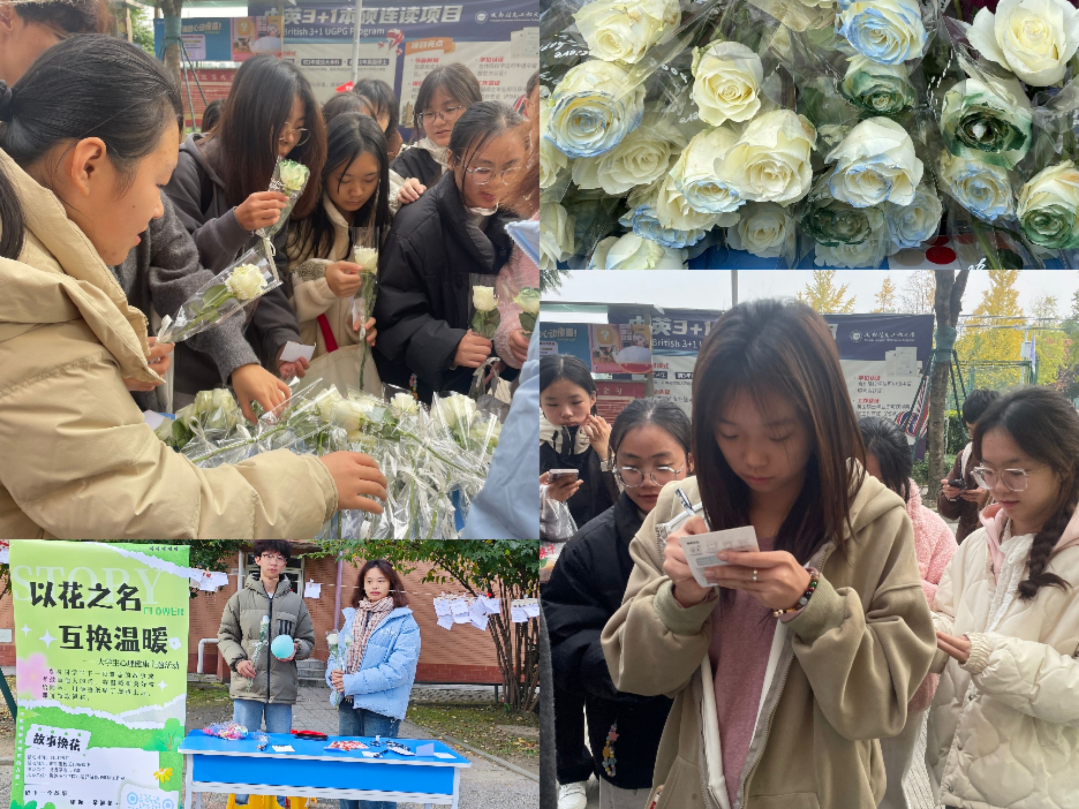 转眼学期过半,为了帮助大家缓解压力,传递正能量,“以花之名,互换温暖”老员工心理健康主题活动于11月29日在航空港校区13栋楼下举行。此次活动由党委员工工作部主办,suncitygroup太阳集团心晴驿站心理健康工作室承办,旨在通过分享故事和鼓励的话语来传递温暖和力量。参与者只需写下一段难忘的故事或几句鼓励他人的话贴在展板上,即可领取一束鲜花作为交换。