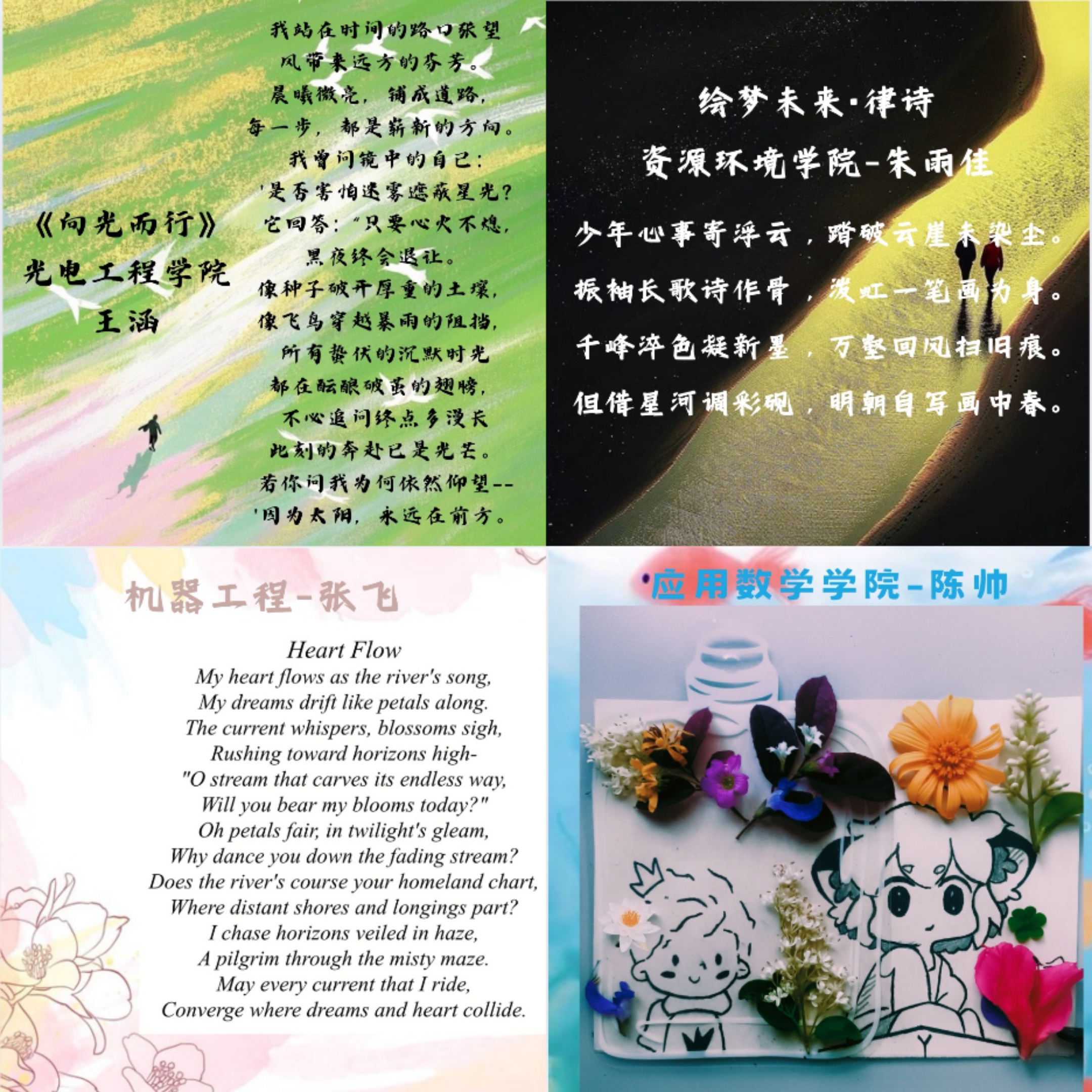 活动开展以来,受到了同学们的广泛关注与积极响应。同学们充分发挥想象力与创造力,投稿了很多优秀作品。在诗歌组中,通过细腻的笔触书写对未来的憧憬,抒发面对挑战时的坚定信念。绘画作品组里,斑斓的色彩、独特的构图将同学们心中的美好愿景具象化。最终,心晴驿站工作室秉持公平公正原则,评选出四个赛道的获奖者,分别为:现代诗赛道——光电工程公司王涵等两位同学,律诗赛道——suncitygroup太阳集团朱雨佳等两位同学,英文诗赛道——自动化公司张飞等两位同学,绘画赛道——应用数学公司陈帅等两位同学。